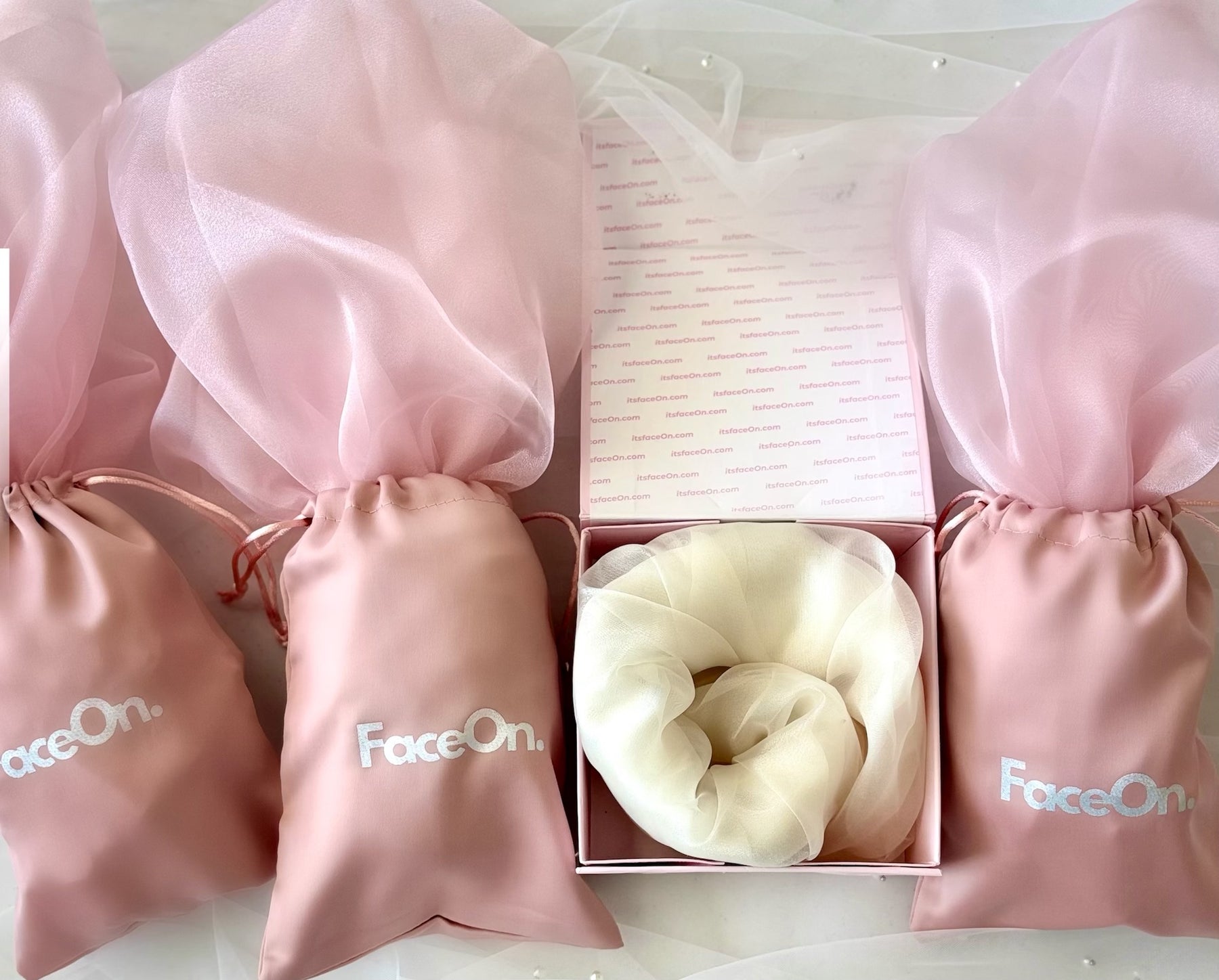 •    Bridesmaid FaceOns include satin pouches, perfect for “Will You Be My Bridesmaid?” gifts or getting ready moments